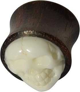 Damen Herren Double Flared Plug Flesh Tunnel Lobe Piercing aus Sonoholz Holz mit Bone Knochen Inlay in weiß dunkel, Totenschädel Skull, 8mm bis 14mm