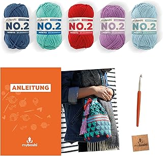 myboshi Häkelset Tasche Shunan, inkl. No.2 Wolle, Nadel und Anleitung, DIY-Häkelpaket, leichtes Sommergarn, Umhänge-Tasche 85% Baumwolle, 15% Kapok Blaubeere, Meerblau, Tomate, Candy, Himmelblau mit Häkelnadel
